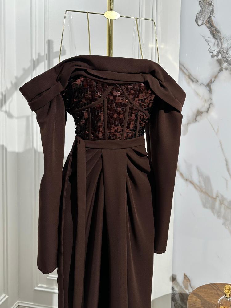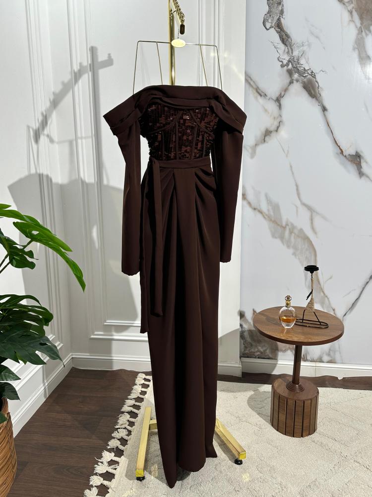 فساتين فستان سهره️ الالوان :بني ، لون الترند الخامه : كريب باربي +قماش سهره تول